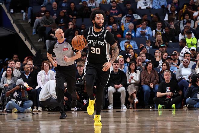本场比赛中,马刺的先发锋线大将朱利安-尚帕尼(Julian Champagnie)的表现算得上是令人刮目相看。尚帕尼全场出场28分39秒,投篮7中4,三分线外6中3,得到了11分5篮板4助攻2抢断1盖帽的数据,正负值为+29。尚帕尼的出手次数其实并不多,但是他还是展现出了相当不错的投射能力,他也是抓住了有限的机会得到了不少分数,他甚至还展现出了不俗的传球能力和策应能力,这样的表现也是远远超出大家的预期的。尚帕尼在防守端的表现同样是可圈可点的,他的个人防守能力同样是非常突出的水平,同样是能够起到关键的作用的。不夸张地说,以尚帕尼在本场比赛中的表现,说他是一名顶级3D锋线球员,都是毫不为过的。